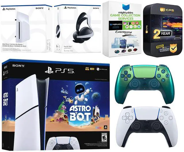INCLUDED: Sony PlayStation 5 Digital, 2x Controllers, Astro Bot download code, Disc Drive Attachment, Pulse Elite Wireless Headset (White), HDMI cable, AC power cord, MightySkins Game Collection Services and 2 Year CPS Extended Warranty