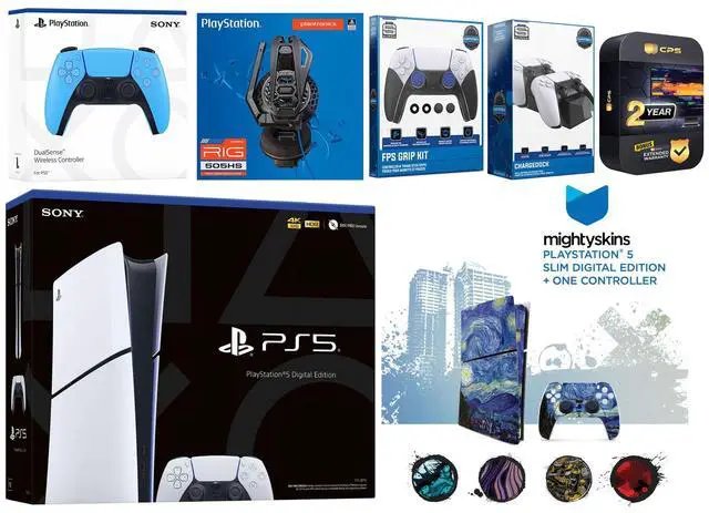 Sony PlayStation 5 Slim Digital Console, 2x Dualsense Controllers, Plantronics RIG 505 HS Gaming Headset, FPS Grip Kit with Precision Aiming Rings, Dual Controller Charge Dock, MightySkins Console + Controller Decal Code, HDMI cable, AC power cord, USB cable, and 2 Year Extended CPS Warranty