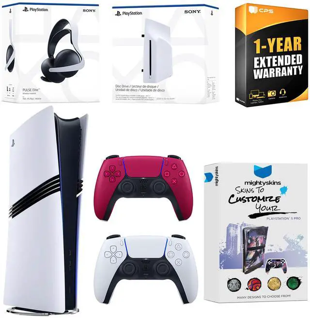 • INCLUDED: Sony PlayStation 5 Pro Digital, 2x Controllers, Disc Drive Attachment, Pulse Elite Wireless Headset (White), HDMI cable, AC power cord, MightySkins code and 1 Year CPS Extended Warranty