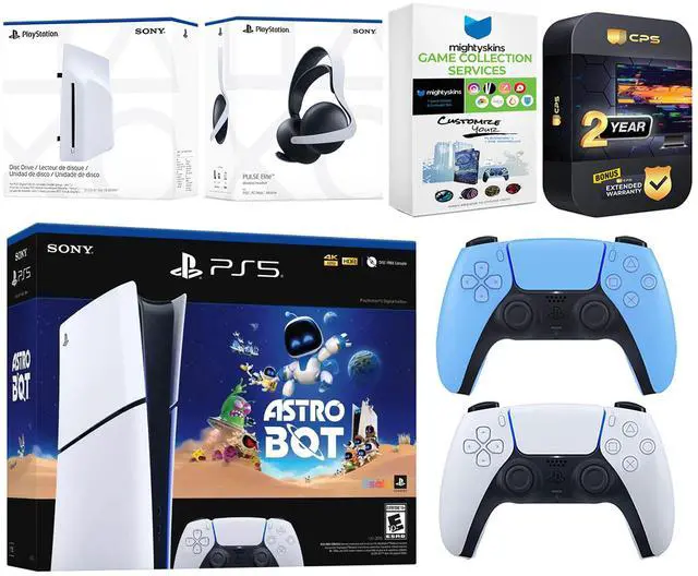 INCLUDED: Sony PlayStation 5 Digital, 2x Controllers, Astro Bot download code, Disc Drive Attachment, Pulse Elite Wireless Headset (White), HDMI cable, AC power cord, MightySkins Game Collection Services and 2 Year CPS Extended Warranty