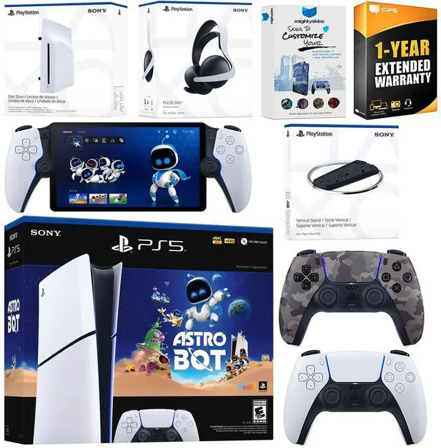 INCLUDED: Sony PlayStation 5 Digital, 2x Controllers, Astro Bot download, Pulse Elite Wireless Headset (White), Disc Drive Attachment, PlayStation Portal, Vertical Stand, HDMI cable, AC power cord, MightySkins Voucher and 1 Year CPS Extended Warranty