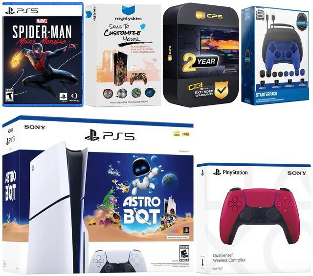 INCLUDED: Sony PS5 Disc, 2x Controllers, ASTRO BOT Download, Spider-Man Miles Morales Game, Pro Gamer Kit, MightySkins code, CPS 2 Year Protection Plan