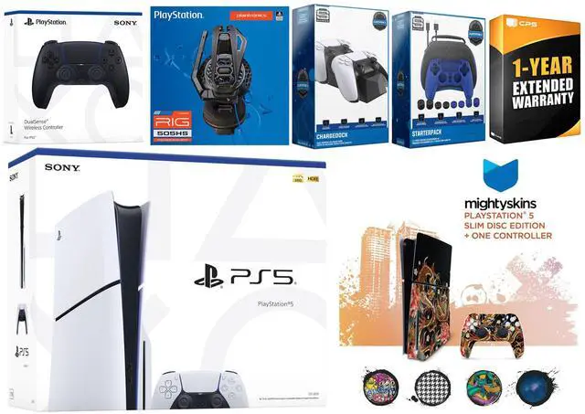 Sony PlayStation 5 Digital, 2x Controllers, Plantronics Headset, Pro Gamer Starter Pack, Controller Charge Dock, MightySkins Code, HDMI cable, and 1 Year CPS Extended Warranty