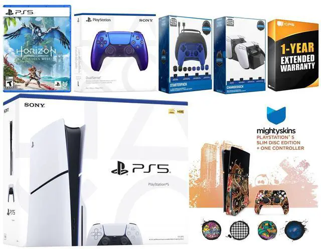 • INCLUDED: Sony PlayStation 5 Slim Disc Console, 2x Dualsense Controllers, Horizon Forbidden West Physical Game, Pro Gamer Starter Pack 11-Piece Accessory Kit, Dual Controller Charge Dock, MightySkins Console + Controller Decal Code, HDMI cable, AC power cord, USB cable, and Warranty