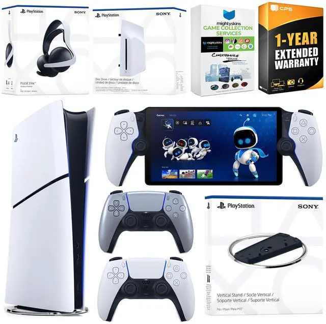Sony PlayStation 5 Slim Digital Bundle with Disc Drive, Stand, Extra Controller, Pulse Elite Headset, PlayStation Portal, MightySkins Voucher and 1 Year Extended Warranty - Sterling Silver