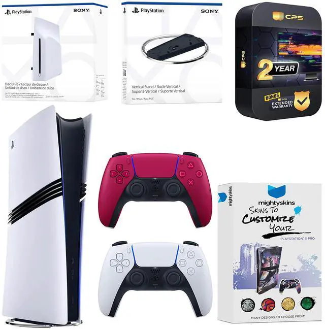 Sony PlayStation 5 Pro, 2x Controllers, Disc Drive Attachment, Vertical Stand, HDMI cable, AC power cord, MightySkins code and 2 Year CPS Extended Warranty