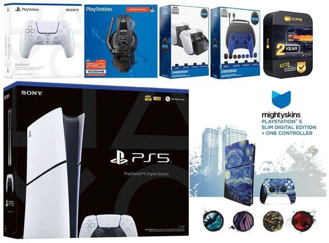 Sony PlayStation 5 Slim Digital Console, 2x Dualsense Controllers, Plantronics RIG 505 HS Gaming Headset, Pro Gamer Starter Pack 11-Piece Accessory Kit, Dual Controller Charge Dock, MightySkins Console + Controller Decal Code, HDMI cable, AC power cord, USB cable, and 2 Year Extended CPS Warranty