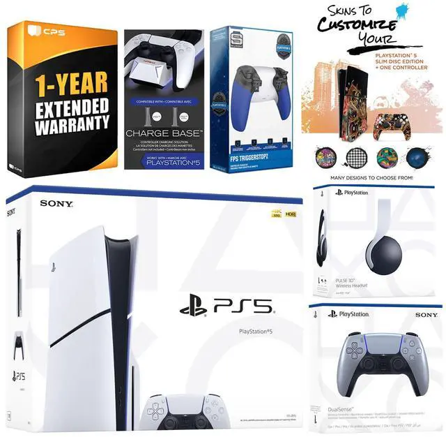 Sony PlayStation 5 Digital, 2x Controllers, Headset, FPS Trigger Kit, Controller Charge Dock, MightySkins Code, HDMI cable, AC power cord, USB cable, and 1 Year CPS Extended Warranty
