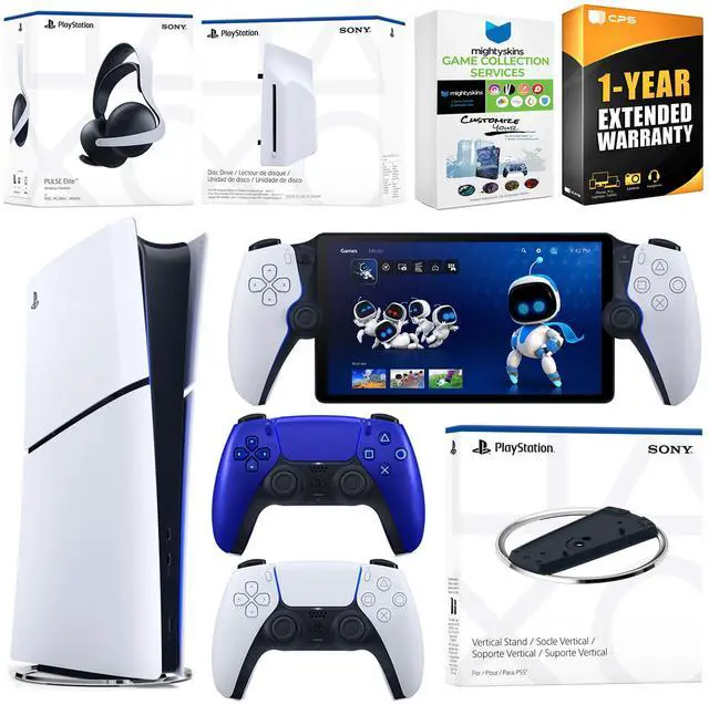 INCLUDED: Sony PlayStation 5 Digital, 2x Controllers, Disc Drive Attachment, Pulse Elite Wireless Headset (White), PlayStation Portal, Sony PS5 Vertical Stand, HDMI cable, AC power cord, MightySkins code and 1 Year CPS Extended Warranty