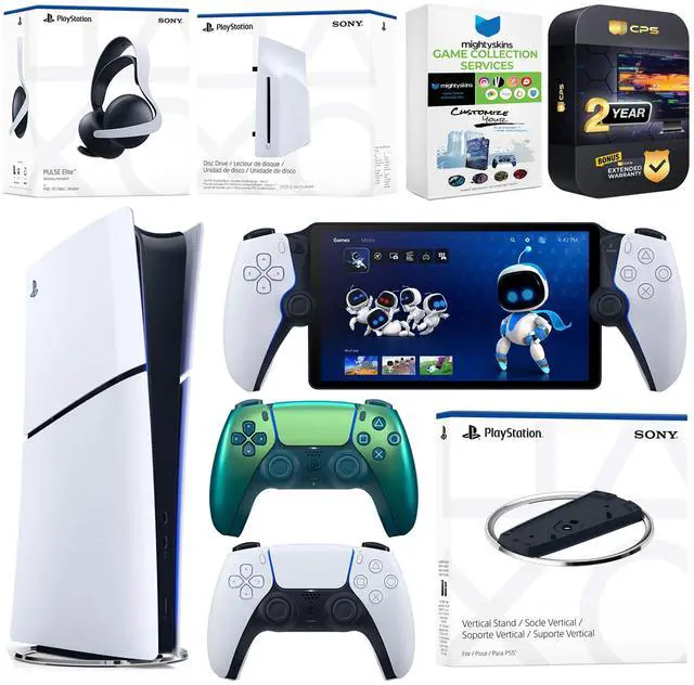 INCLUDED: Sony PlayStation 5 Digital, 2x Controllers, Disc Drive Attachment, Pulse Elite Wireless Headset (White), PlayStation Portal, Sony PS5 Vertical Stand, HDMI cable, AC power cord, MightySkins Game Collection Services and 2 Year CPS Extended Warranty