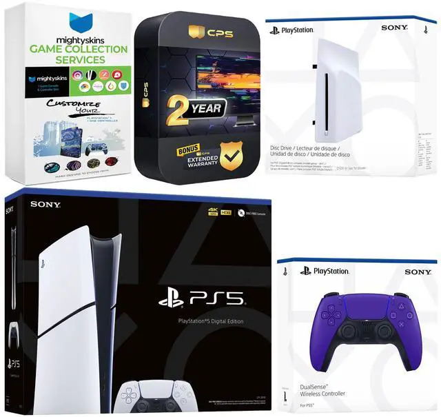 Sony PlayStation 5 Slim Digital Bundle with Disc Drive, Extra Controller, MightySkins Game Collection and 2 Year Extended Warranty - Galactic Purple