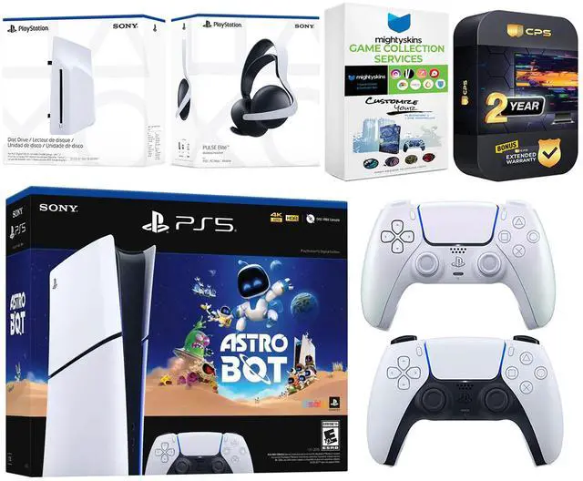 INCLUDED: Sony PlayStation 5 Digital, 2x Controllers, Astro Bot download code, Disc Drive Attachment, Pulse Elite Wireless Headset (White), HDMI cable, AC power cord, MightySkins Game Collection Services and 2 Year CPS Extended Warranty