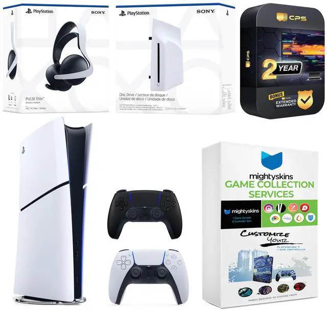 INCLUDED: Sony PlayStation 5 Digital, 2x Controllers, Disc Drive Attachment, Pulse Elite Wireless Headset (White), HDMI cable, AC power cord, MightySkins Game Collection Services and 2 Year CPS Extended Warranty