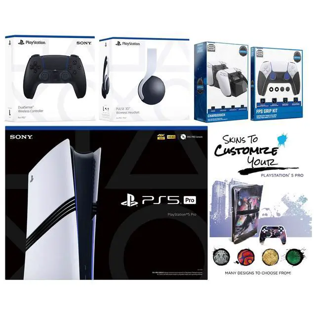 • INCLUDED: Sony PlayStation 5 Pro Console, 2x Dualsense Controllers, Sony PULSE 3D Wireless Gaming Headset, FPS Grip Kit with Precision Aiming Rings, Dual Controller Charge Dock, MightySkins Console + Controller Decal Code, HDMI cable, AC power cord, USB cable