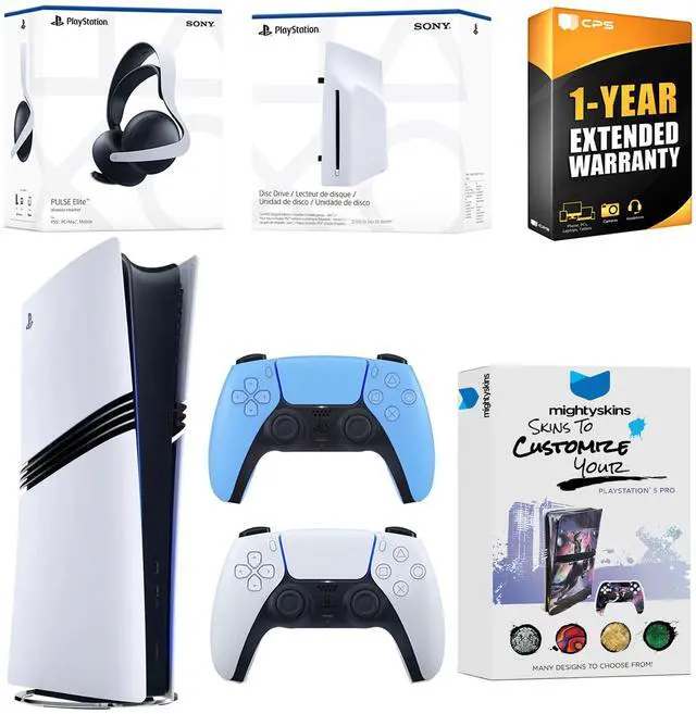 INCLUDED: Sony PlayStation 5 Pro Digital, 2x Controllers, Disc Drive Attachment, Pulse Elite Wireless Headset (White), HDMI cable, AC power cord, MightySkins code and 1 Year CPS Extended Warranty
