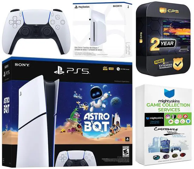 INCLUDED: Sony PlayStation 5 Digital, 1x Controller, Astro Bot download, Disc Drive Attachment, HDMI cable, AC power cord, MightySkins Game Collection Services and 2 Year CPS Extended Warranty