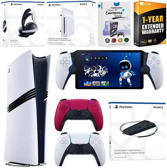 Sony PlayStation 5 Pro, 2x Controllers, Disc Drive Attachment, Vertical Stand, Pulse Elite Wireless Headset (White), PlayStation Portal, HDMI cable, AC power cord, MightySkins code and 1 Year CPS Extended Warranty