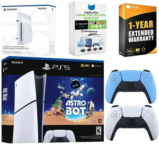 INCLUDED: Sony PlayStation 5 Digital, 2x Controllers, Astro Bot download, Disc Drive Attachment, HDMI cable, AC power cord, MightySkins Game Collection Services codes and 1 Year CPS Extended Warranty