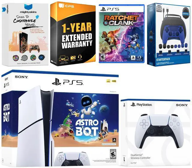 • INCLUDED: Sony PS5 Disc, 2x Controllers, ASTRO BOT Download, Rachet and Clank Disc Game, Pro Gamer Kit, MightySkins code, CPS 1 Year Protection Plan