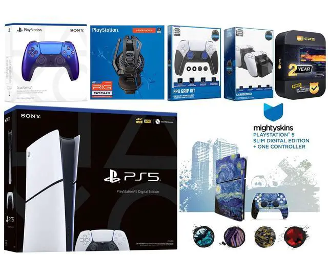 Sony PlayStation 5 Slim Digital Console, 2x Dualsense Controllers, Plantronics RIG 505 HS Gaming Headset, FPS Grip Kit with Precision Aiming Rings, Dual Controller Charge Dock, MightySkins Console + Controller Decal Code, HDMI cable, AC power cord, USB cable, and 2 Year Extended CPS Warranty
