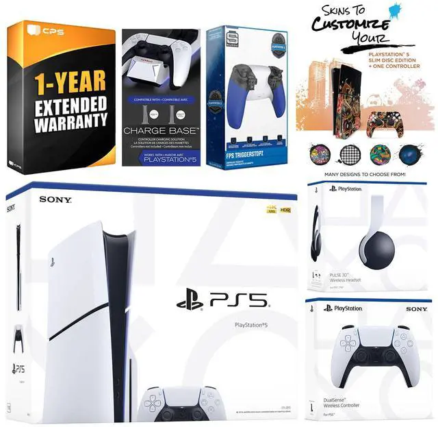 Sony PlayStation 5 Digital, 2x Controllers, Headset, FPS Trigger Kit, Controller Charge Dock, MightySkins Code, HDMI cable, AC power cord, USB cable, and 1 Year CPS Extended Warranty