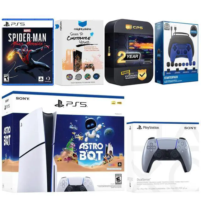 INCLUDED: Sony PS5 Disc, 2x Controllers, ASTRO BOT Download, Spider-Man Miles Morales Game, Pro Gamer Kit, MightySkins code, CPS 2 Year Protection Plan