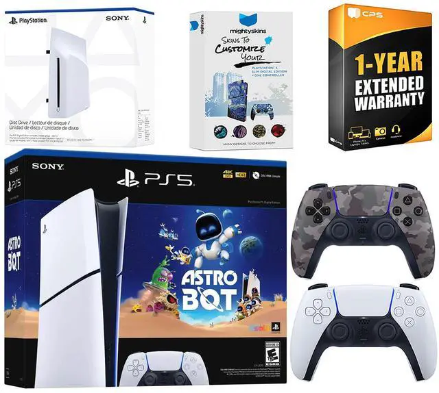 INCLUDED: Sony PlayStation 5 Digital, 2x Controllers, Astro Bot download, Disc Drive Attachment, HDMI cable, AC power cord, MightySkins Voucher and 1 Year CPS Extended Warranty
