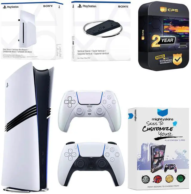 Sony PlayStation 5 Pro, 2x Controllers, Disc Drive Attachment, Vertical Stand, HDMI cable, AC power cord, MightySkins code and 2 Year CPS Extended Warranty