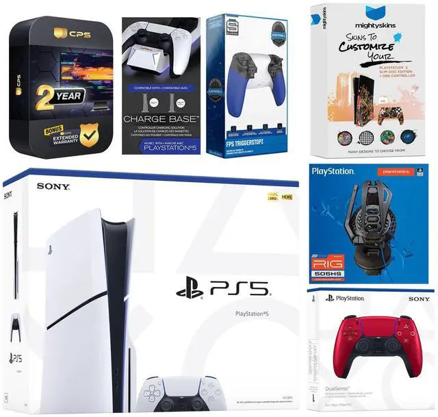 Sony PlayStation 5 Slim Digital Console, 2x Dualsense Controllers, Plantronics RIG 505 HS Gaming Headset, Trigger Kit with Adjustable Stops, Dual Controller Charge Dock, MightySkins Console + Controller Decal Code, HDMI cable, AC power cord, USB cable, and 2 Year Extended CPS Warranty