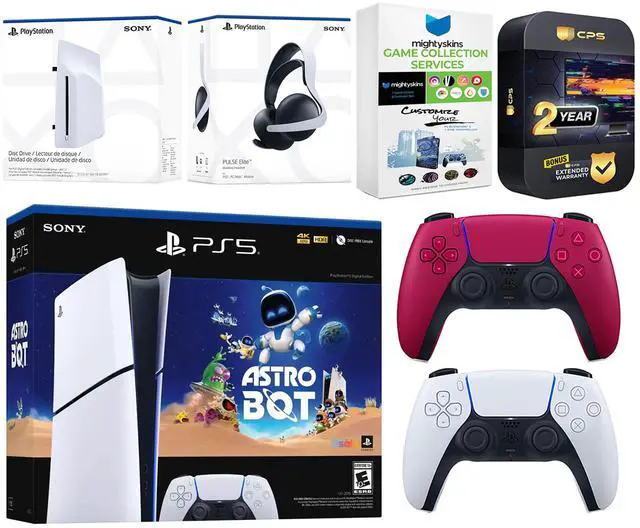 Sony PlayStation 5 Slim Digital Astro Bot Bundle with Disc Drive, Extra Controller, Pulse Elite Headset, MightySkins Game Services and 2 Year Extended Warranty - Cosmic Red