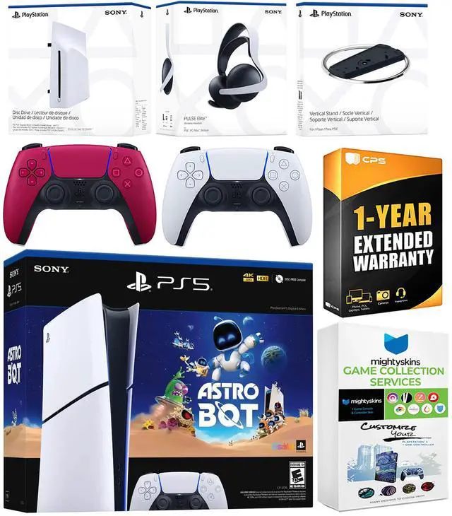 Sony PlayStation 5 Astro Bot Slim Digital Bundle with Disc Drive, Pulse Elite Headset, Extra Controller, Vertical Stand, MightySkins Game Collection Services and 1 Year Extended Warranty - Cosmic Red