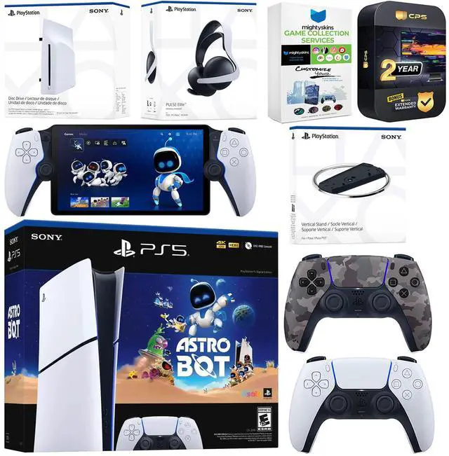 INCLUDED: Sony PlayStation 5 Digital, 2x Controllers, Astro Bot download, Pulse Elite Wireless Headset (White), Disc Drive Attachment, PlayStation Portal, Vertical Stand, HDMI cable, AC power cord, MightySkins Game Collection Services codes and 2 Year CPS Extended Warranty