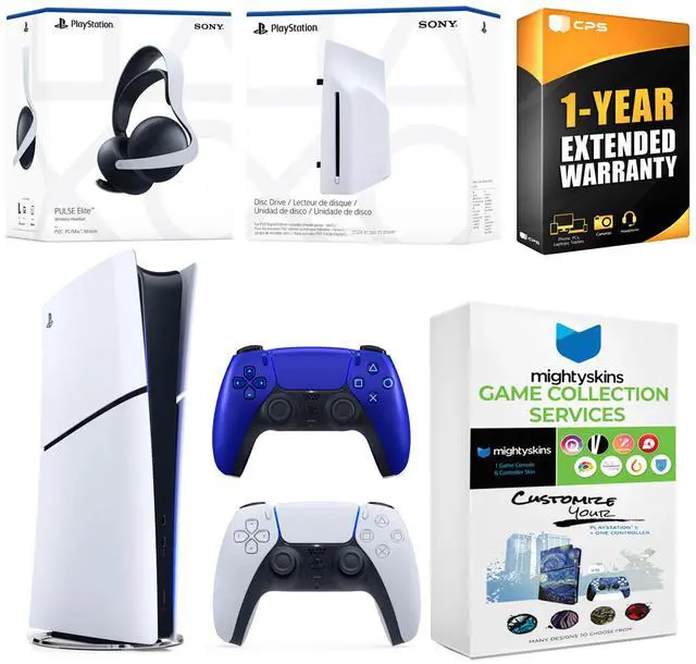 INCLUDED: Sony PlayStation 5 Digital, 2x Controllers, Disc Drive Attachment, Pulse Elite Wireless Headset (White), HDMI cable, AC power cord, MightySkins Game Collection Services and 1 Year CPS Extended Warranty