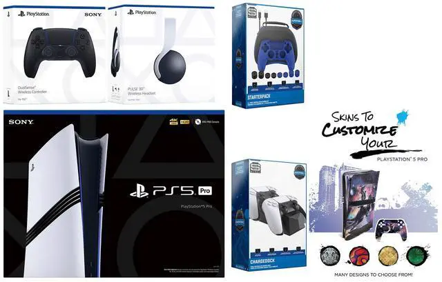 Sony PlayStation 5 Pro Console, 2x Dualsense Controllers, Sony PULSE 3D Wireless Gaming Headset, Pro Gamer Starter Pack 11-Piece Accessory Kit, Dual Controller Charge Dock, MightySkins Console + Controller Decal Code, HDMI cable, AC power cord, USB cable