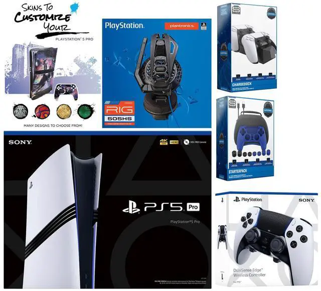 Sony PlayStation 5 Pro, 2x Controllers, Plantronics Headset, Pro Gamer Starter Pack, Controller Charge Dock, MightySkins Code, HDMI cable, and 1 Year CPS Extended Warranty