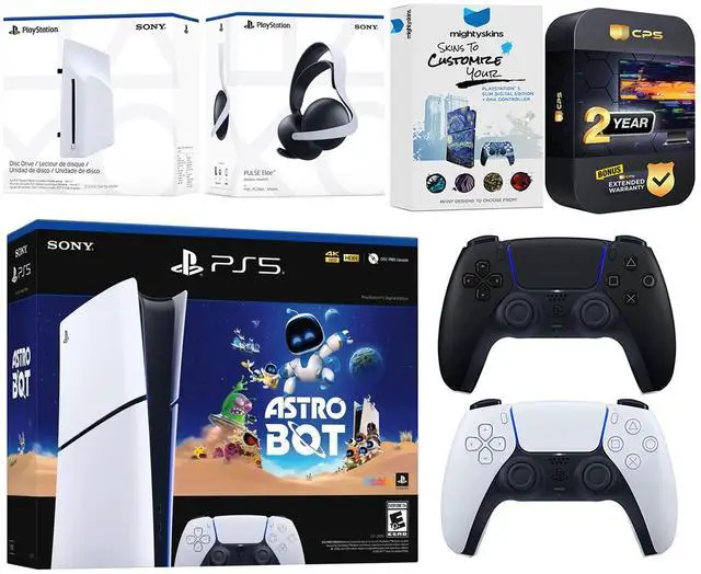 INCLUDED: Sony PlayStation 5 Digital, 2x Controllers, Astro Bot download code, Disc Drive Attachment, Pulse Elite Wireless Headset (White), HDMI cable, AC power cord, MightySkins Code and 2 Year CPS Extended Warranty
