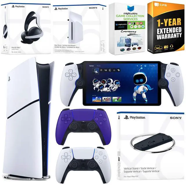 Sony PlayStation 5 Slim Digital Bundle with Disc Drive, Stand, Extra Controller, Pulse Elite Headset, PlayStation Portal, MightySkins Voucher and 1 Year Extended Warranty - Galactic Purple