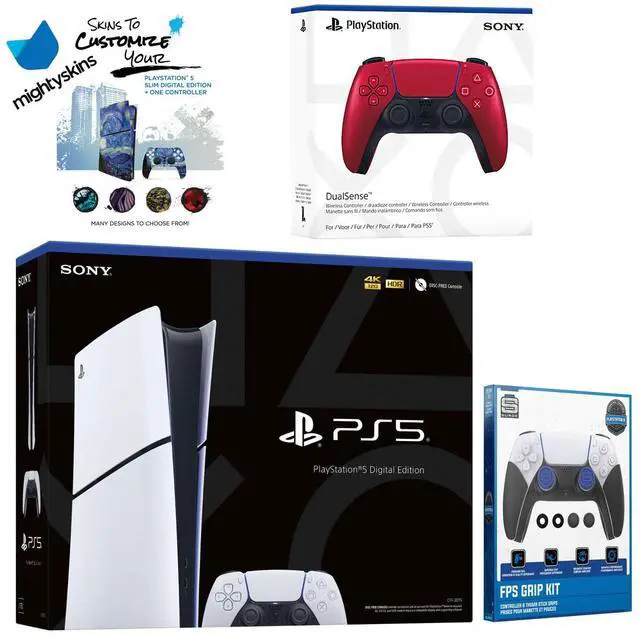 • INCLUDED: Sony PlayStation 5 Digital Slim Console, 2x Dualsense Controllers, HDMI cable, AC power cord, USB cable, FPS Grip Kit, MightySkins Voucher