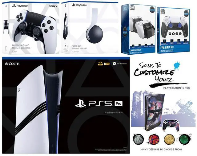 Sony PlayStation 5 Pro Console, 2x Dualsense Controllers, Sony PULSE 3D Wireless Gaming Headset, FPS Grip Kit with Precision Aiming Rings, Dual Controller Charge Dock, MightySkins Console + Controller Decal Code, HDMI cable, AC power cord, USB cable