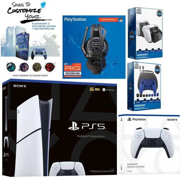 Sony PlayStation 5 Digital, 2x Controllers, Plantronics Headset, Pro Gamer Starter Pack, Controller Charge Dock, MightySkins Code, HDMI cable, and 1 Year CPS Extended Warranty