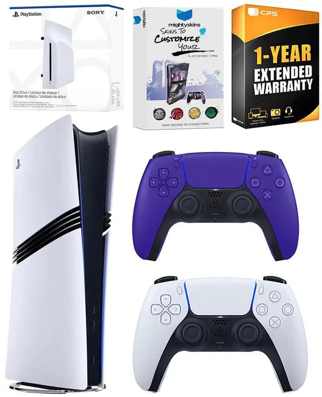 INCLUDED: Sony PlayStation 5 Pro Digital, 2x Controllers, Disc Drive Attachment, HDMI cable, AC power cord, MightySkins code and 1 Year CPS Extended Warranty