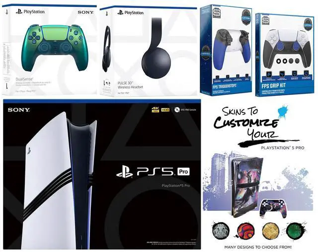 • INCLUDED: Sony PlayStation 5 Pro Console, 2x Dualsense Controllers, Sony PULSE 3D Wireless Gaming Headset, FPS Grip Kit with Precision Aiming Rings, Trigger Kit with Adjustable Stops, MightySkins Console + Controller Decal Code, HDMI cable, AC power cord, USB cable, and Warranty