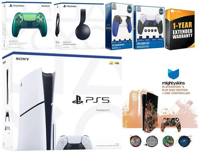 Sony PlayStation 5 Digital, 2x Controllers, Sony PULSE 3D Headset, FPS Grip Kit, Trigger Kit, MightySkins Code and 1 Year CPS Extended Warranty
