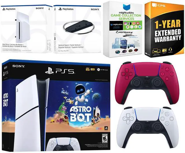 INCLUDED: Sony PlayStation 5 Digital, 2x Controllers, Astro Bot download, Disc Drive Attachment, Vertical Stand, HDMI cable, AC power cord, MightySkins code and 1 Year CPS Extended Warranty