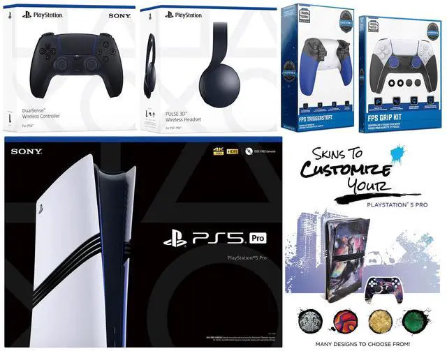 Sony PlayStation 5 Pro Console, 2x Dualsense Controllers, Sony PULSE 3D Wireless Gaming Headset, FPS Grip Kit with Precision Aiming Rings, Trigger Kit with Adjustable Stops, MightySkins Console + Controller Decal Code, HDMI cable, AC power cord, USB cable