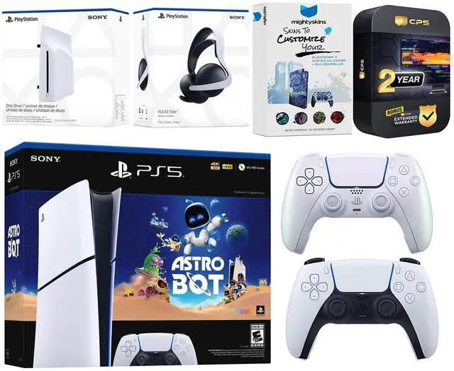 INCLUDED: Sony PlayStation 5 Digital, 2x Controllers, Astro Bot download code, Disc Drive Attachment, Pulse Elite Wireless Headset (White), HDMI cable, AC power cord, MightySkins Code and 2 Year CPS Extended Warranty