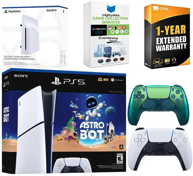 INCLUDED: Sony PlayStation 5 Digital, 2x Controllers, Astro Bot download, Disc Drive Attachment, HDMI cable, AC power cord, MightySkins Game Collection Services codes and 1 Year CPS Extended Warranty