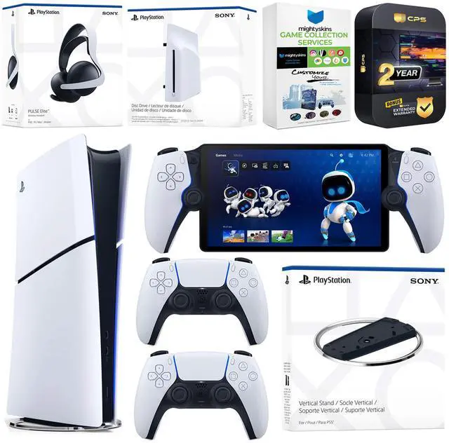 INCLUDED: Sony PlayStation 5 Digital, 2x Controllers, Disc Drive Attachment, Pulse Elite Wireless Headset (White), PlayStation Portal, Sony PS5 Vertical Stand, HDMI cable, AC power cord, MightySkins Game Collection Services and 2 Year CPS Extended Warranty