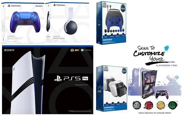 Sony PlayStation 5 Pro Console, 2x Dualsense Controllers, Sony PULSE 3D Wireless Gaming Headset, Pro Gamer Starter Pack 11-Piece Accessory Kit, Dual Controller Charge Dock, MightySkins Console + Controller Decal Code, HDMI cable, AC power cord, USB cable