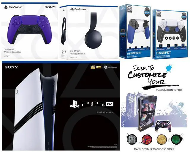 Sony PlayStation 5 Pro Console, 2x Dualsense Controllers, Sony PULSE 3D Wireless Gaming Headset, FPS Grip Kit with Precision Aiming Rings, Trigger Kit with Adjustable Stops, MightySkins Console + Controller Decal Code, HDMI cable, AC power cord, USB cable